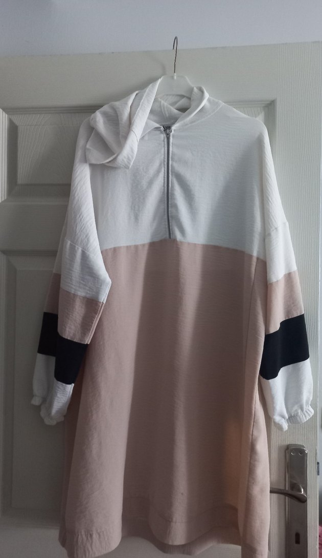 Uzun boylu, bol kesim kadın tunik. Uzun kollu, yüksek yakalı ve fermuarlı. Beyaz, pudra ve siyah renklerde, sentetik kumaştan. Günlük rahat sokak stili için uygun.