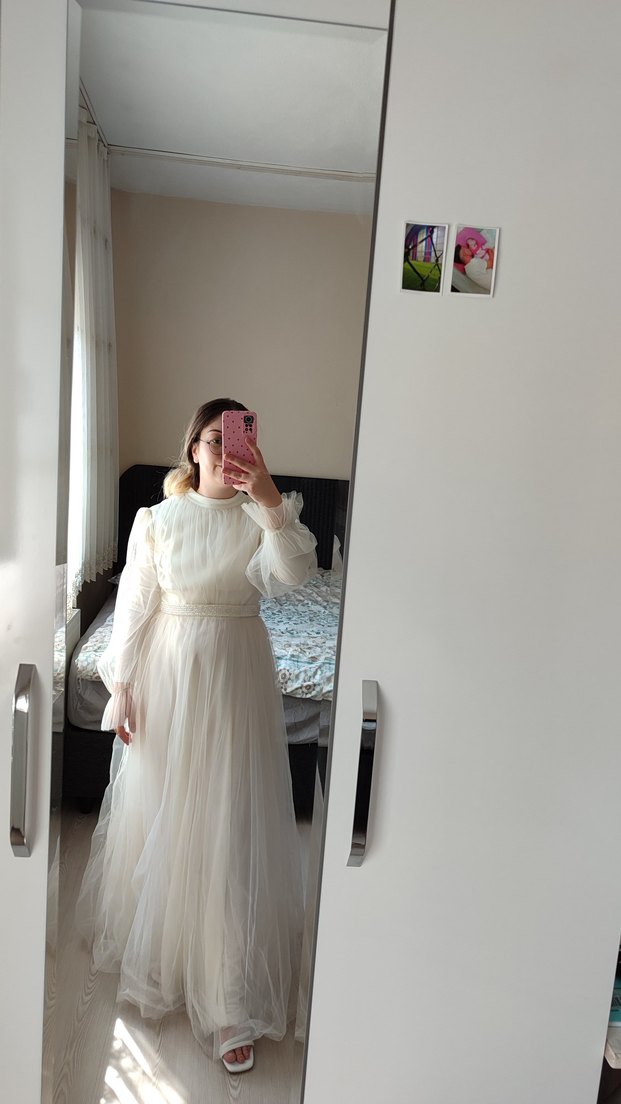 Uzun kollu ve yüksek yakalı, beyaz bohem tarzda A kesim gelinlik. Gevşek kesimi ve hafif kumaşı ile klasik ve zarif bir görünüm sunar. Astar kısmında bir leke var gözükmüyor bile ama yine astar kısmında arkada bir yırtık var terzide halledilir ama