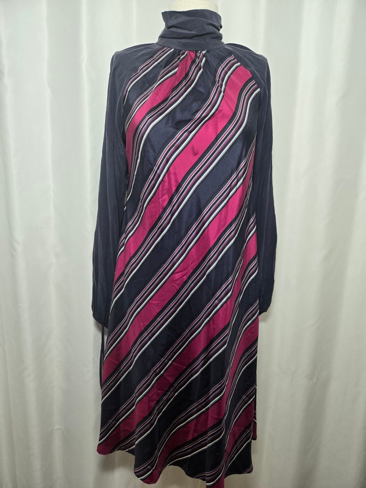 Uzun ve bol kesimli bu elbise, yüksek yakalı ve uzun kolludur. İpek kumaştan olup, koyu çok renkli çizgili drapeli desene sahiptir. Ofise uygundur.