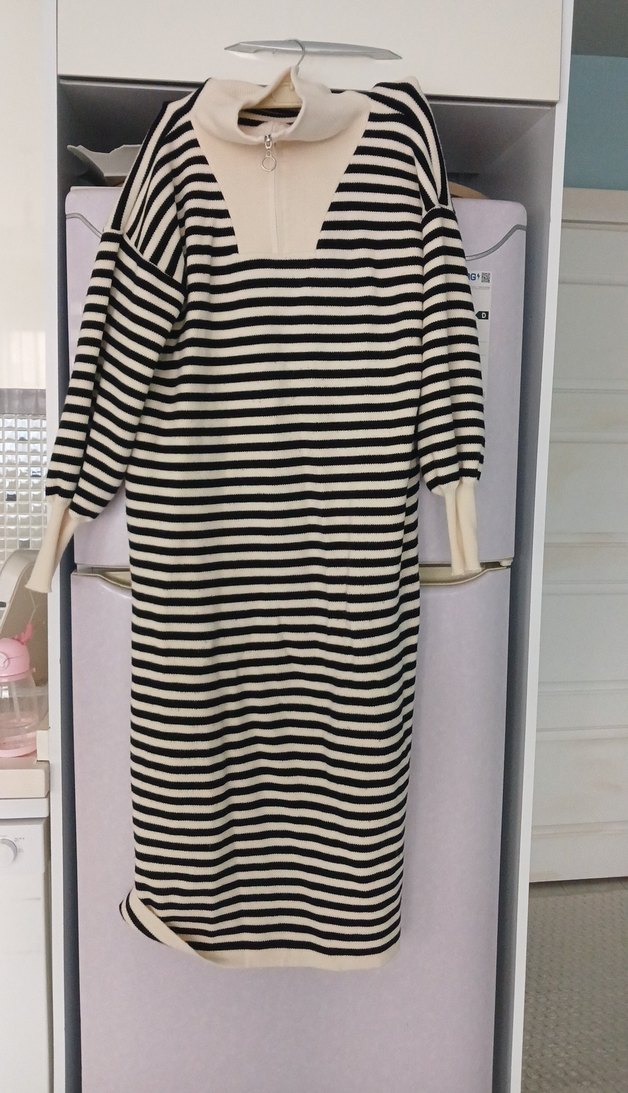 Uzun boy, yüksek yakalı ve uzun kollu, beyaz ve gri çizgili triko elbise. Yumuşak sentetik kumaştan, günlük kullanıma uygun Paris tarzı.