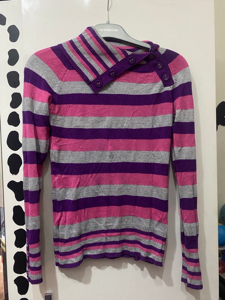 Uzun kollu, düğmeli yüksek yakalı triko kazak. Mor, pembe ve gri çizgili desene sahip, rahat sokak stili için uygun.