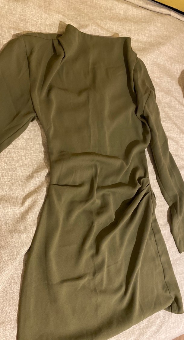 Haki renkli, uzun kollu ve yüksek yakalı bu keten elbise, vücuda oturan kesimi ve drapeli detayıyla modern bir görünüm sunar. Romantik akşamlar için uygundur.