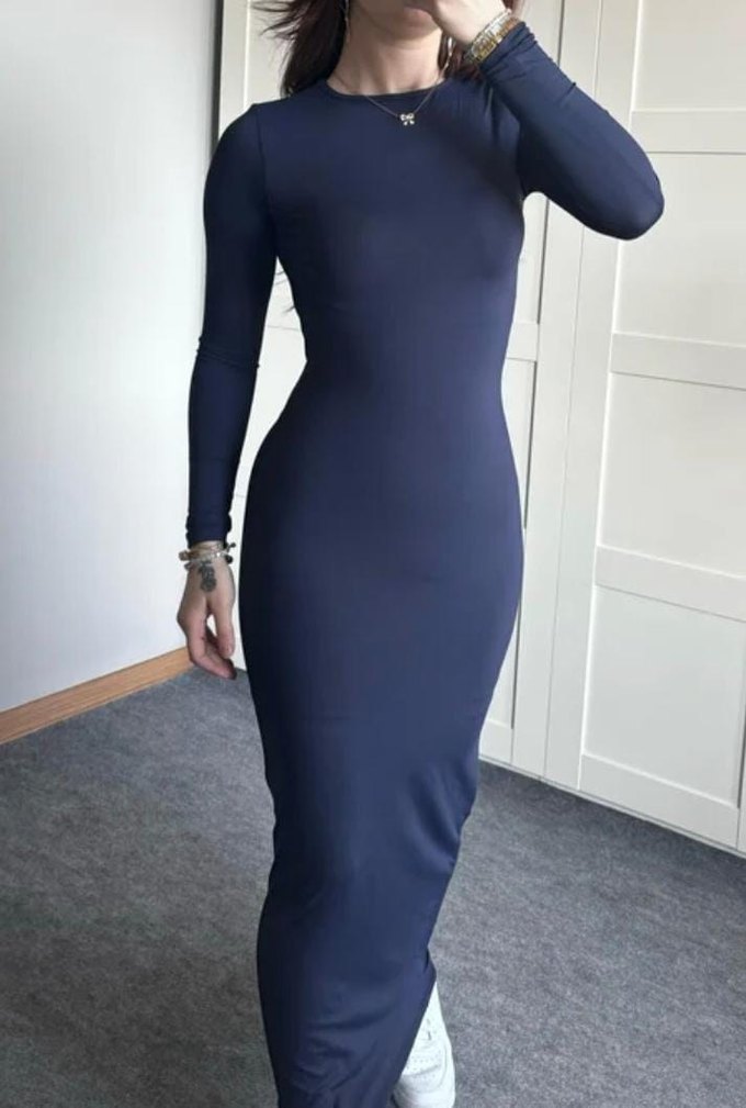 Kadınlar için uzun kollu, yüksek yakalı ve vücuda oturan bu elbise, pürüzsüz sentetik kumaştan üretilmiştir. Düz mavi rengiyle gündelik kullanıma uygun, çağdaş ve zahmetsiz şıklık sunar.