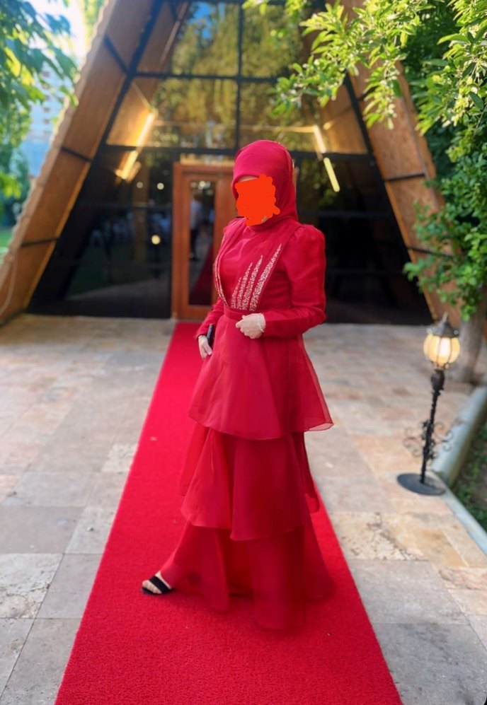 Uzun Kollu, Yüksek Yakalı Kırmızı Abiye Elbise