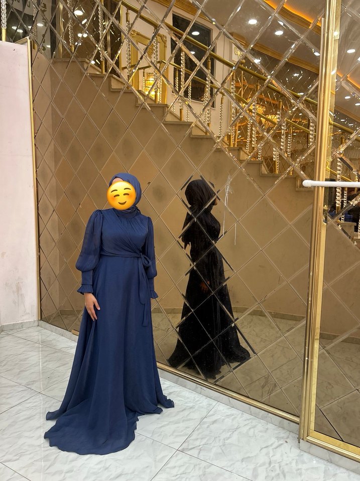 Uzun boy, koyu lacivert renkte, yüksek yakalı ve bol kesimli, drapeli detaylara sahip, modest ve gotik tarzda kadın abiyesi. Şal dahildir 2 saat kullanıldı