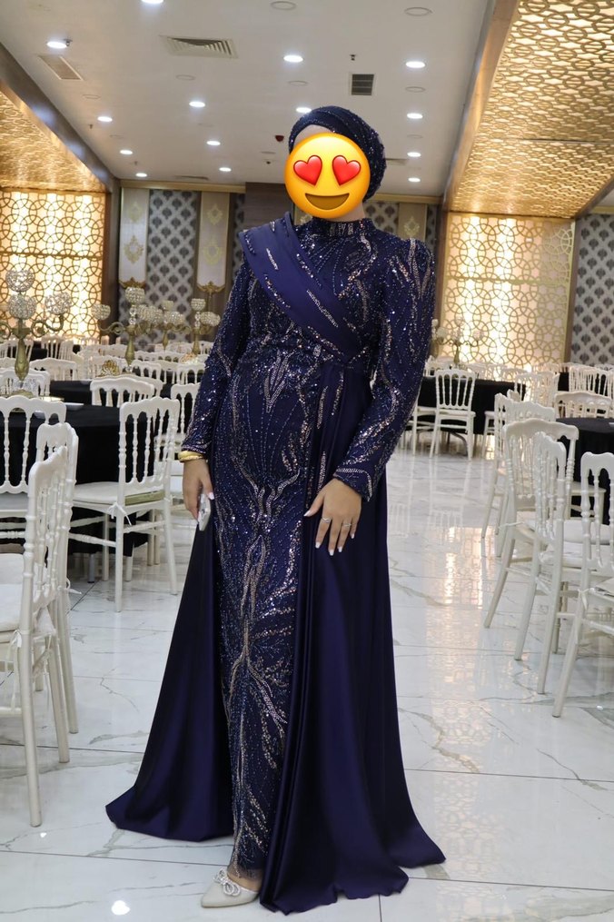 Uzun Kollu, Yüksek Yakalı Mavi Abiye Elbise