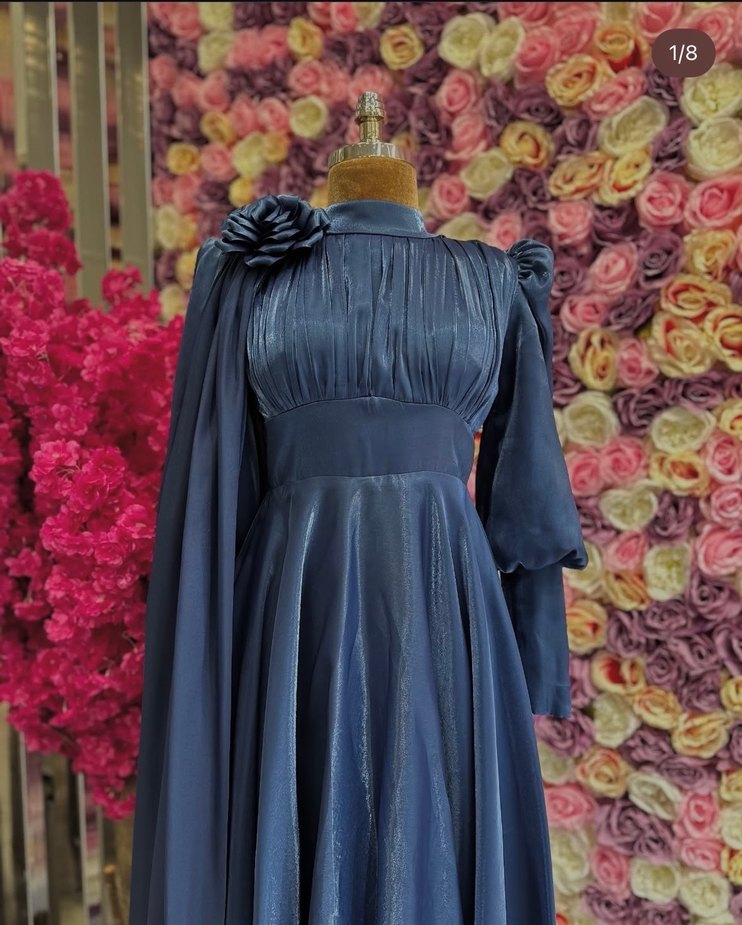 Yüksek yakalı, uzun kollu ve omuzda çiçek detayı olan mavi uzun abiye elbise. Düzenli kesim ve gri tonlarda hafif tie-dye desen içerir. Hiç giyilmedi denendi sadece 38 beden tam oturuyor üstüne Hiçbir defosu yoktur