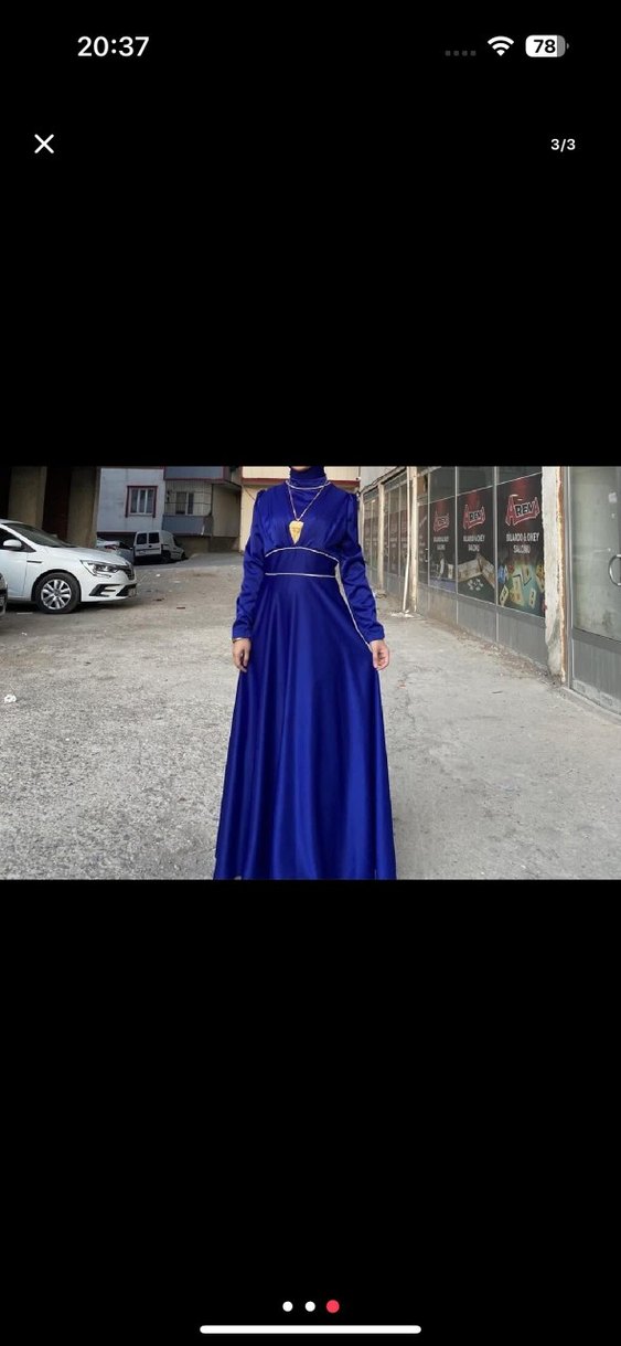 Uzun ve vücuda oturan bu abiye elbise, yüksek yakalı ve uzun kolludur. Parlak mavi renkte, drapeli tasarımı ile modest ve gotik tarzlara uygundur.