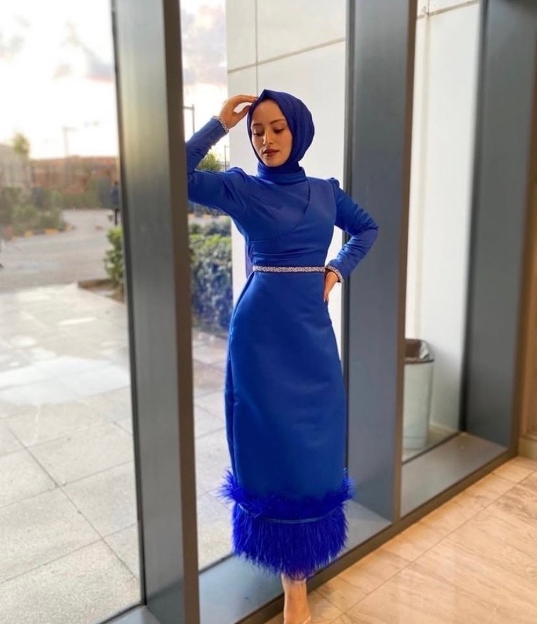 Yüksek yakalı ve uzun kollu, drapeli, parlak mavi etnik desenli, kuş tüyü detaylı uzun ve dar kesim elbise. Modern ve mütevazı tarzda.