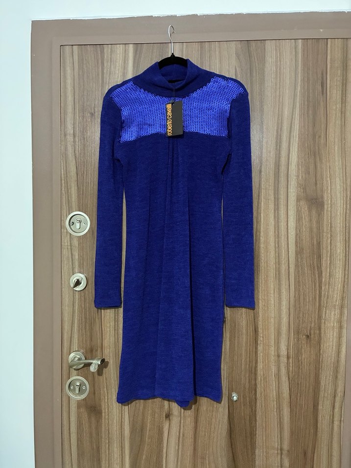 Uzun Kollu Yüksek Yakalı Mavi Triko Elbise