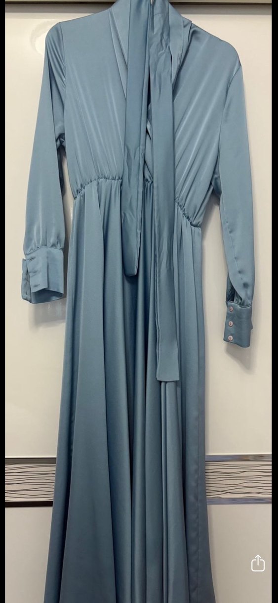 Uzun kollu, yüksek yakalı ve bol kesim olan bu uzun elbise, yumuşak sentetik kumaştan yapılmıştır. Mavi tonlarında drapeli tasarımı ile ofis için uygundur.