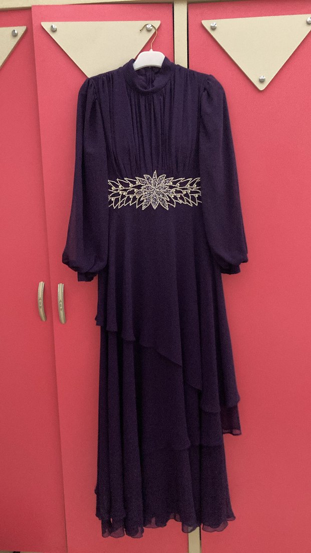 Bol kesim, uzun boy mor abiye elbise yüksek yaka ve uzun kolludur. Bel kısmında işlemeli detaylar ve drapeler bulunur, gösterişli düğünler için uygundur.