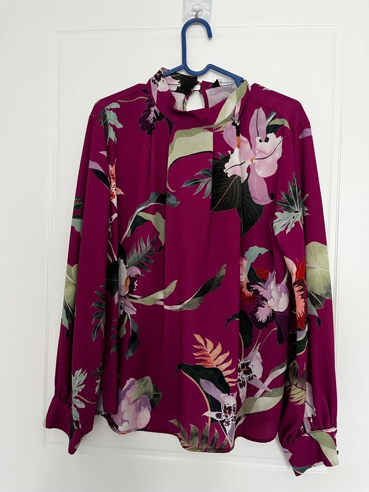 Mor renkli, uzun kollu ve yüksek yakalı bu bluz, bol kesim ve drapeli tasarıma sahiptir. Çiçek desenli ve sentetik yumuşak kumaş.