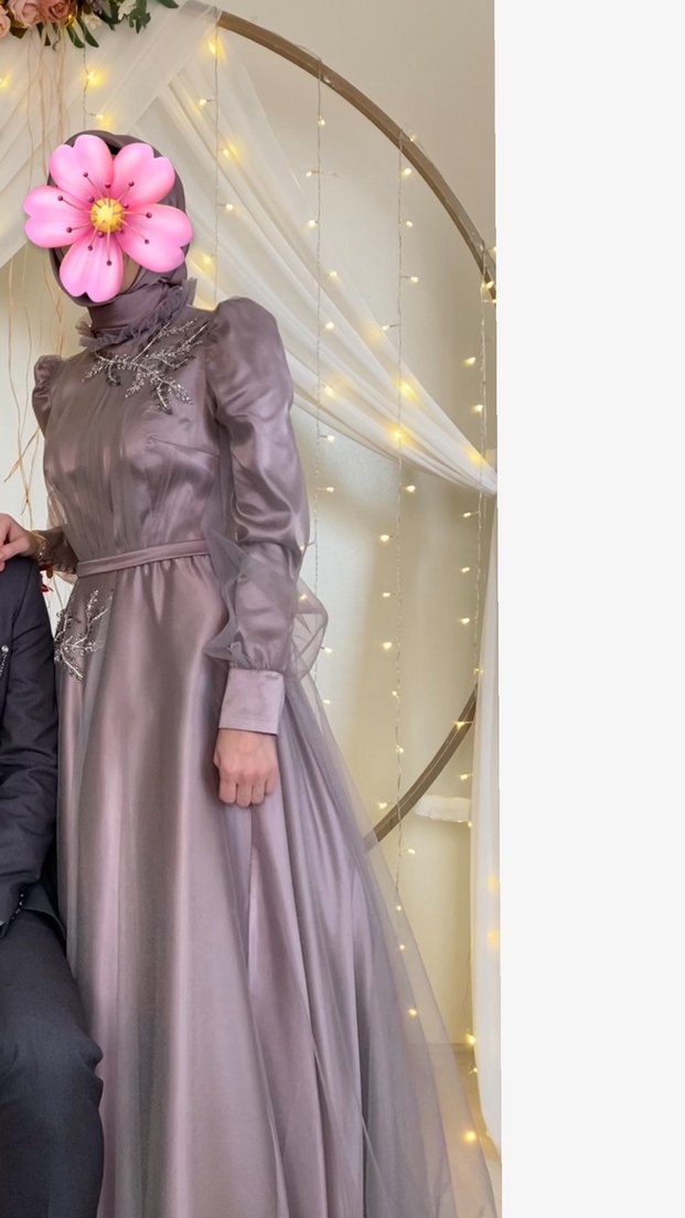 Bu dar kesim nişan elbisesi, yüksek yaka, uzun kollu ve drapeli tasarıma sahiptir. Mor-gri tonunda modern klasik tarzda işlemelidir.