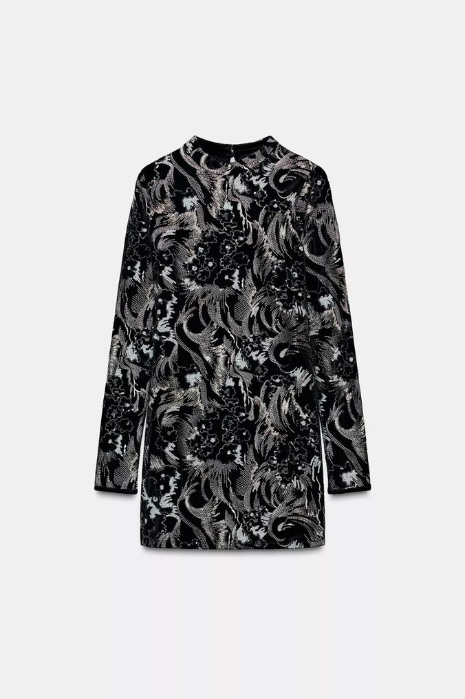 Uzun kollu, yüksek yakalı ve payet işlemeli gri desenli dar kesim elbise, avangard parti tarzı için uygun. ✨