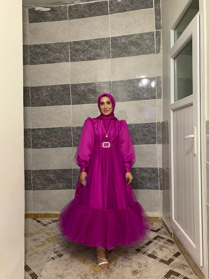 Uzun, bol kesim pembe abiye elbise, yüksek yakalı ve drapeli tasarıma sahiptir. Düğünler için uygundur, sade ve avangart tarzda, askılı kolludur.