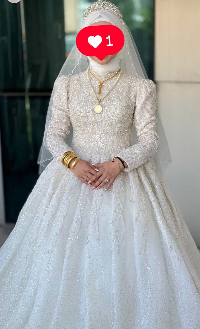 Yüksek yakalı ve uzun kollu, işlemeli prenses kesim beyaz gelinlik. Uzun etekli, klasik ve gösterişli tasarım. duvak ve ayakkabı da vardır