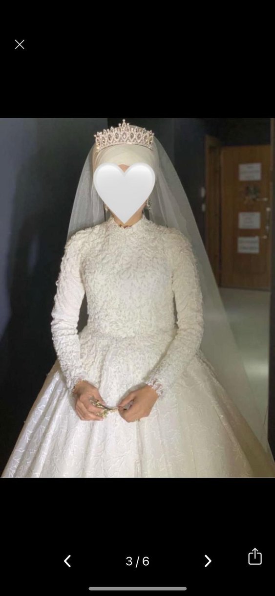 Uzun kollu ve yüksek yakalı klasik prenses gelinlik. Dar kesim üst kısmı ve uzun eteği ile mütevazı bir tarz sunar.