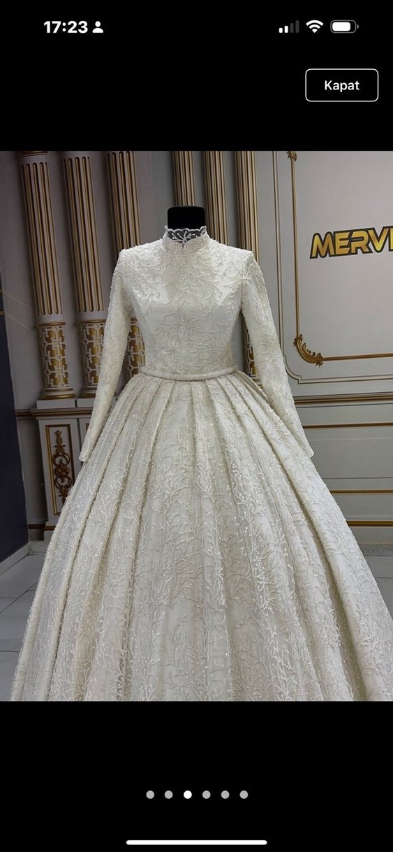Bu beyaz prenses gelinlik, yüksek yaka ve uzun kollu, parlak kumaştan, regular fit ve uzun boyda klasik ve modern tarzı birleştirir. ✨