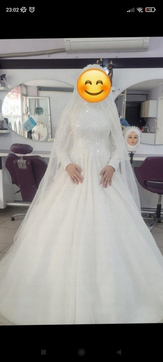 Bu gösterişli prenses gelinlik, yüksek yakalı ve uzun kollu, vücuda oturan kesimiyle dikkat çeker. Uzun beyaz elbise, mütevazı ve şık bir tarz sunar. Tarlatan ve duvak ile Kiralık ya da satın alınabilir.