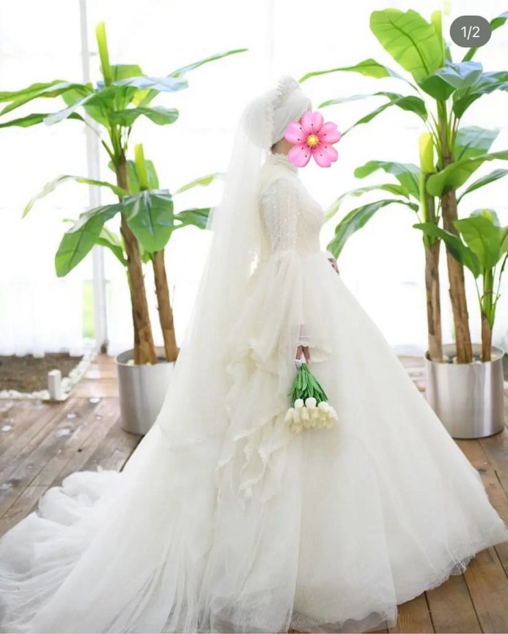 Bu beyaz prenses gelinlik yüksek yakalı ve uzun kollu, vücuda oturan üst kısmı ve uzun akan etekleriyle sade ve bohem tarzda tasarlanmıştır.
