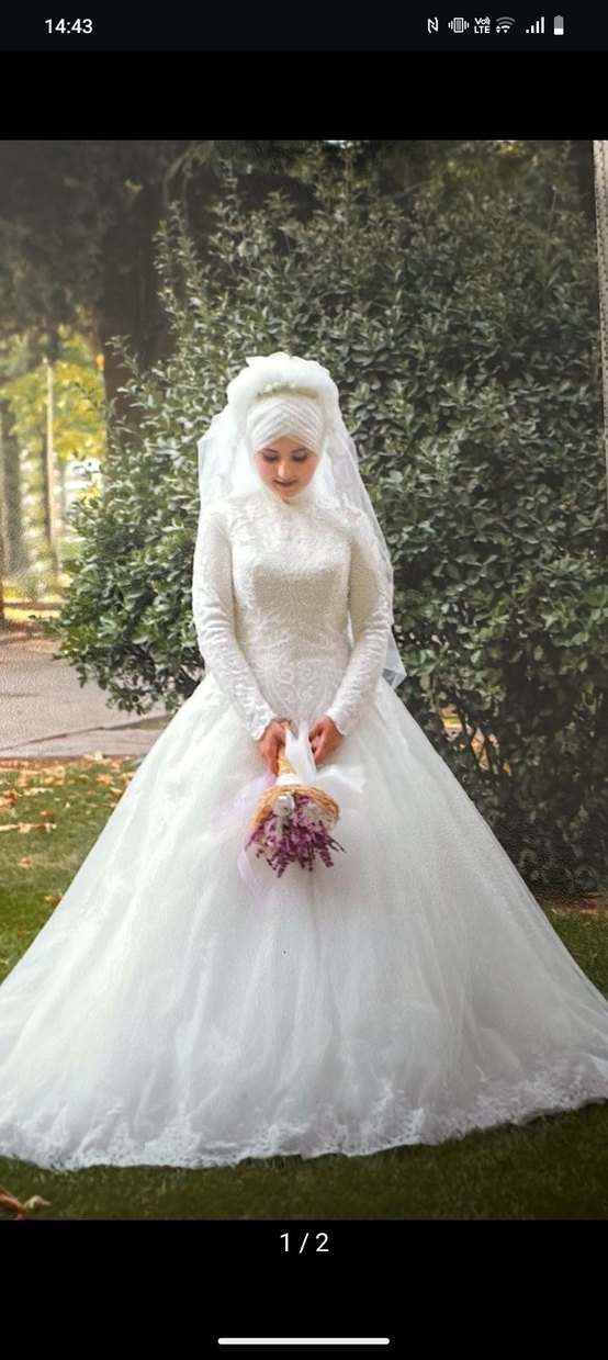 Beyaz prenses gelinlik, uzun kollu ve yüksek yakalı, modest ve bohem tarzı bir araya getirir. Uzun boyu ve detaylarıyla klasik ve şık bir görünüm sunar.