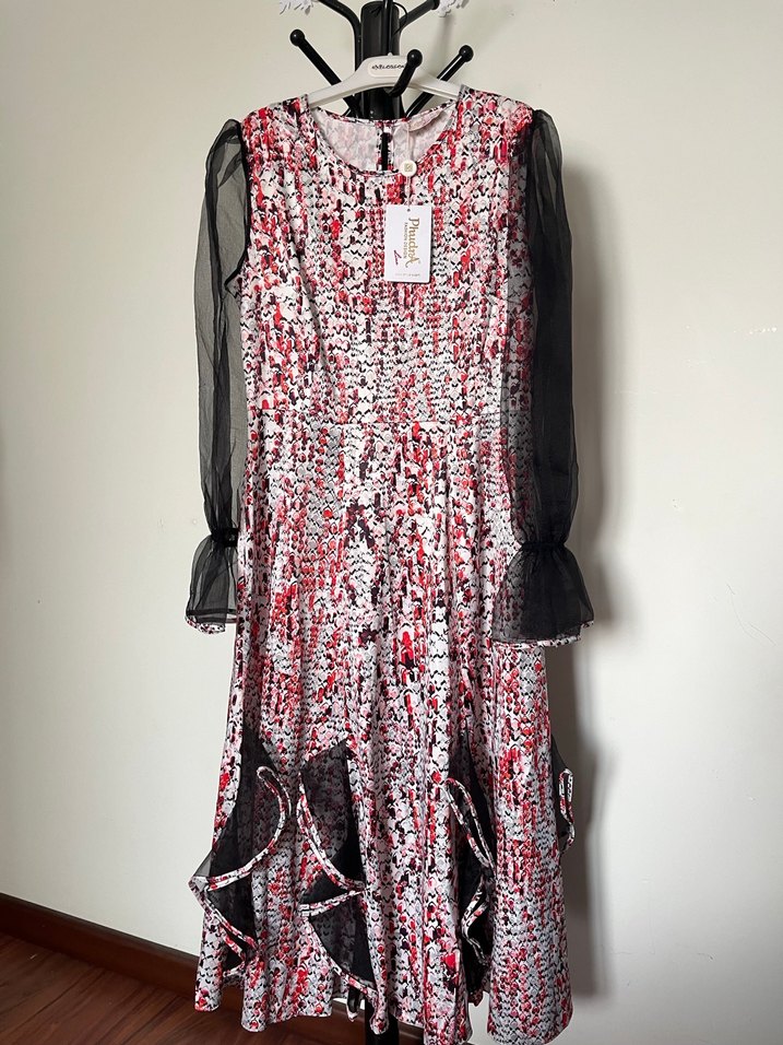 Kadınlar için uzun kollu, yüksek yakalı ve salaş kesim elbise. Kırmızı ve gri batik desenli, sentetik kumaştan ve drapeli detaylı. Günlük kullanıma uygun, gotik ve avangard tarzda.