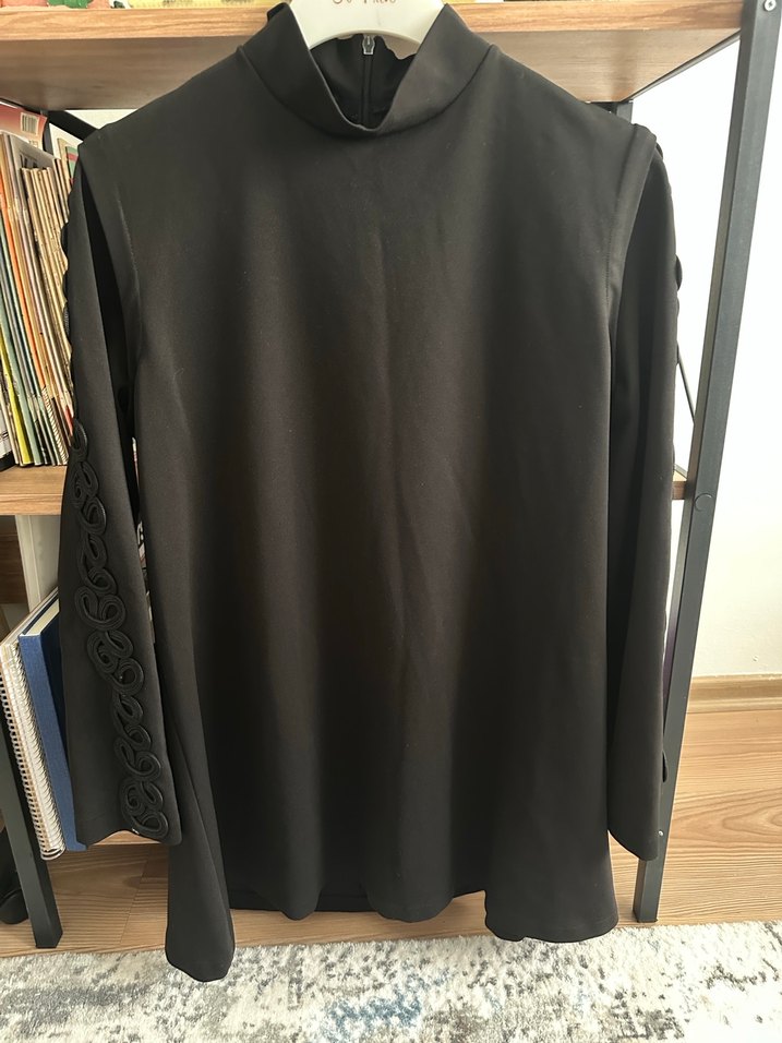 Siyah renkte, uzun kollu ve yüksek yakalı desenli bu gotik tunik, drapeli ve normal kesimiyle ofis için uygundur. Sentetik kumaştan üretilmiştir.