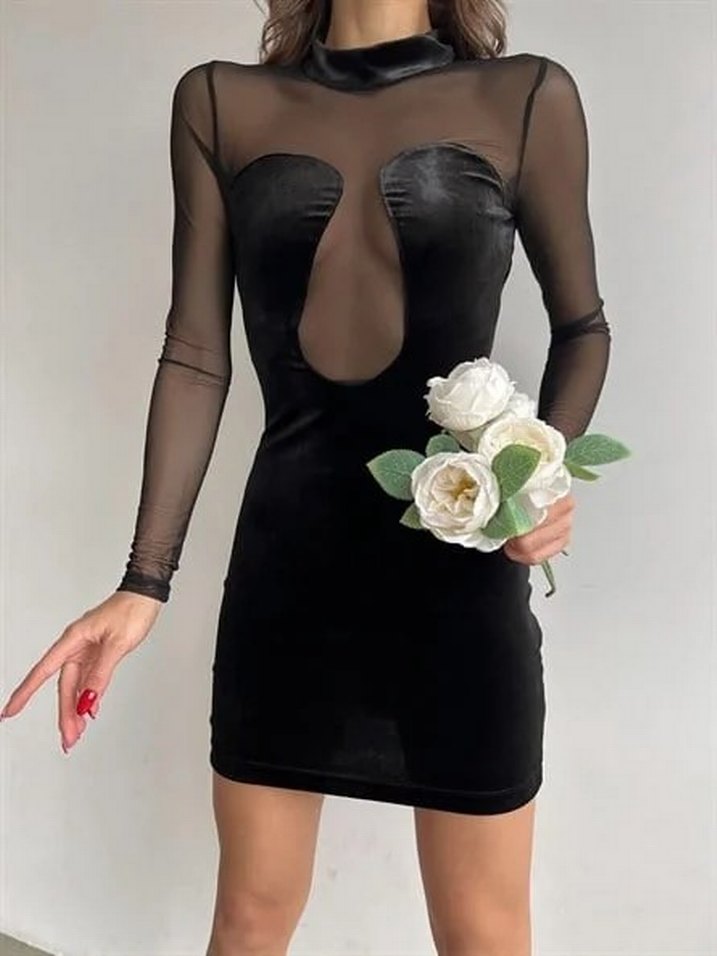 Uzun Kollu Yüksek Yakalı Siyah Transparan kadife Midi Elbise