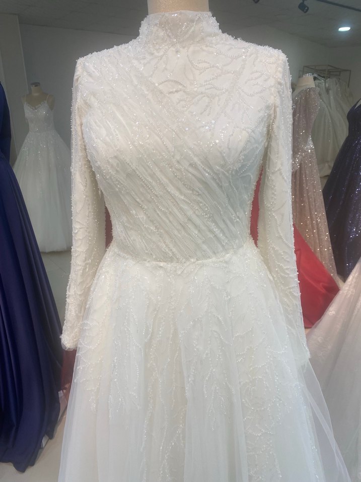 Beyaz renkli, yüksek yakalı ve uzun kollu helen gelinlik. Modern klasik tarzda, gösterişli detaylarla, düzenli kesime sahip. Sorunu yoktur 36:38:40 bedene uyumludur iade yoktur