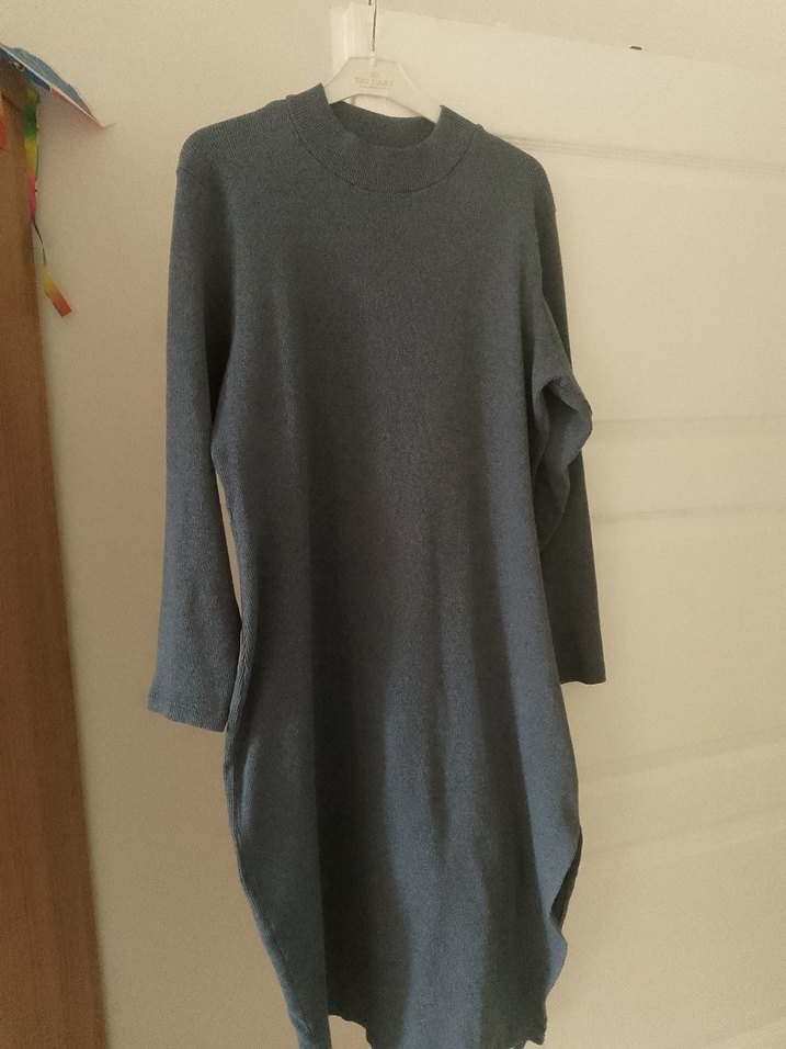 indigo renkli, uzun kollu esnek triko fitilli elbise iki defa giydim yanda bir yırtmacı var