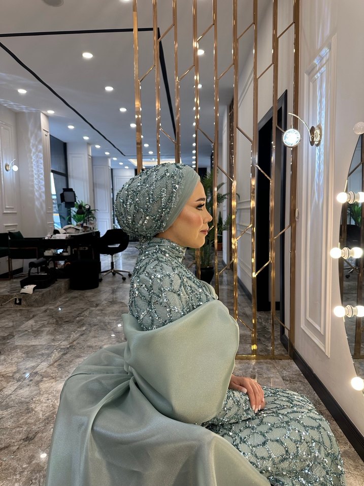 Uzun Kollu Yüksek Yakalı Turkuaz Nişan Elbisesi