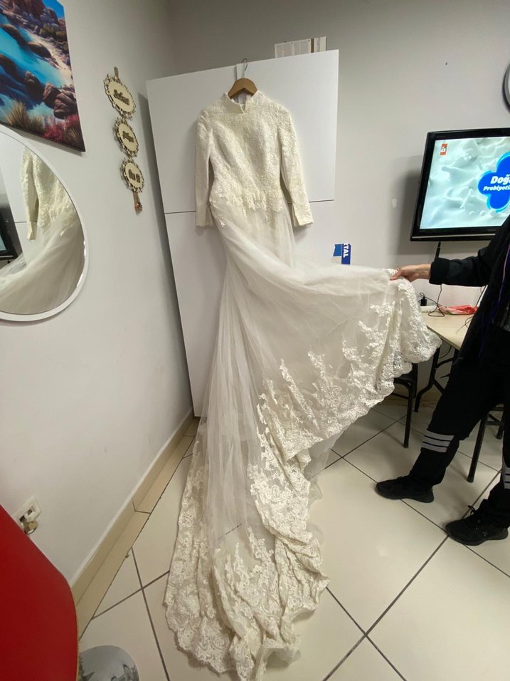 Uzun kollu, yüksek yakalı beyaz gelinlik, vintage tarzda dantel detaylı ve uzun kuyruklu klasik şıklık sunar.