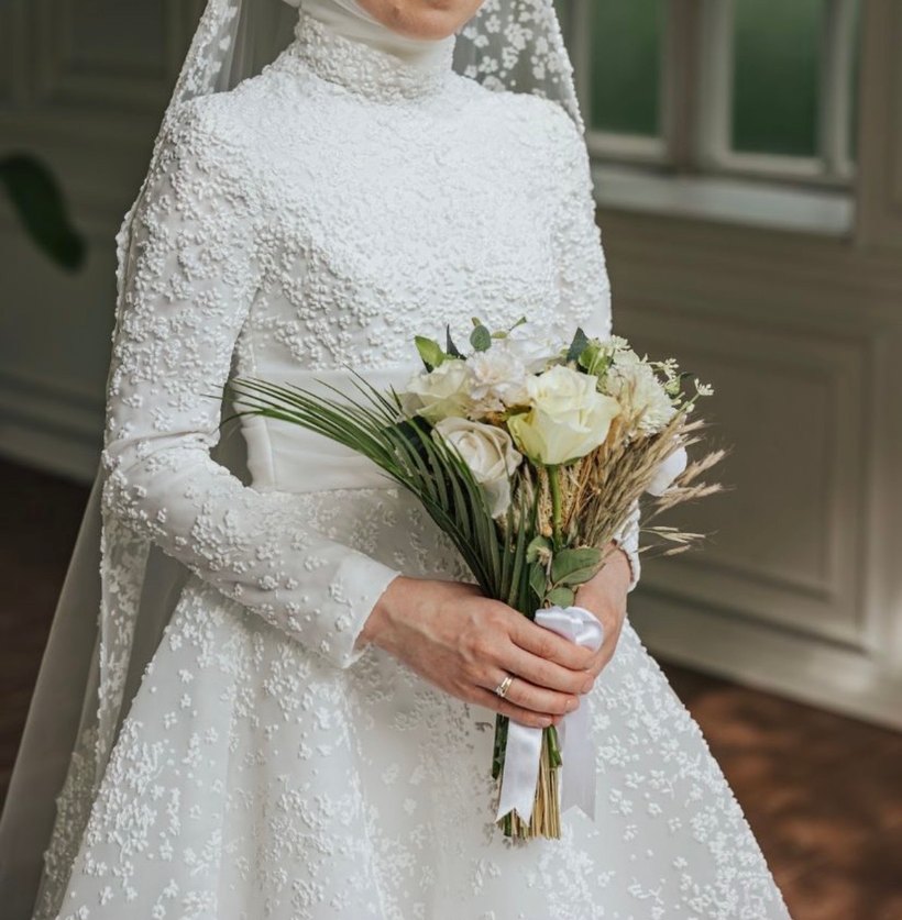 Uzun kollu, yüksek yakalı vintage tarzda, çiçek dokulu ve düzenli kesime sahip yumuşak beyaz prenses gelinlik. Boy155 kilo45