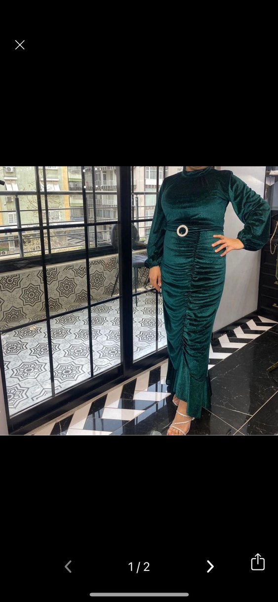 Bu yeşil kadife kumaştan, yüksek yakalı ve uzun kollu, drapeli detaylara sahip, beli kemer tokalı uzun ve vücuda oturan kumaşa sahip bir kez yek giyildı tertemizdir