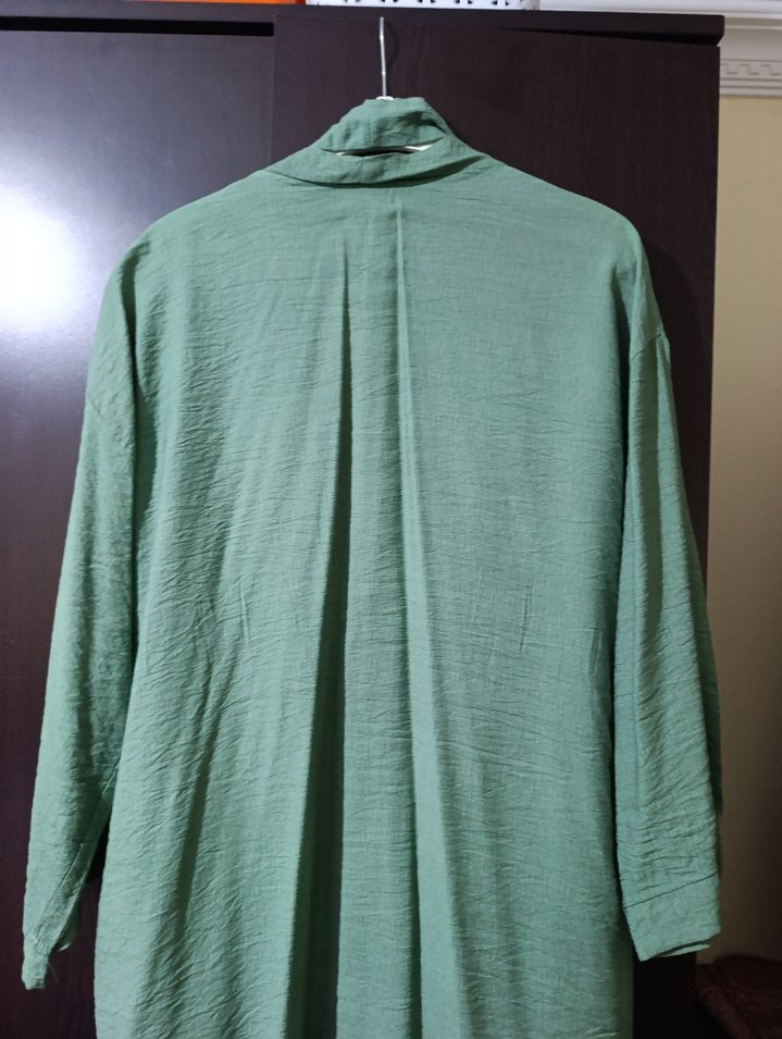 Yeşil keten kumaştan, yüksek yakalı ve uzun kollu, bol kesim bir kimona. Dökümlü uzun boyuyla minimalist, normcore tarzda günlük kullanıma uygun.