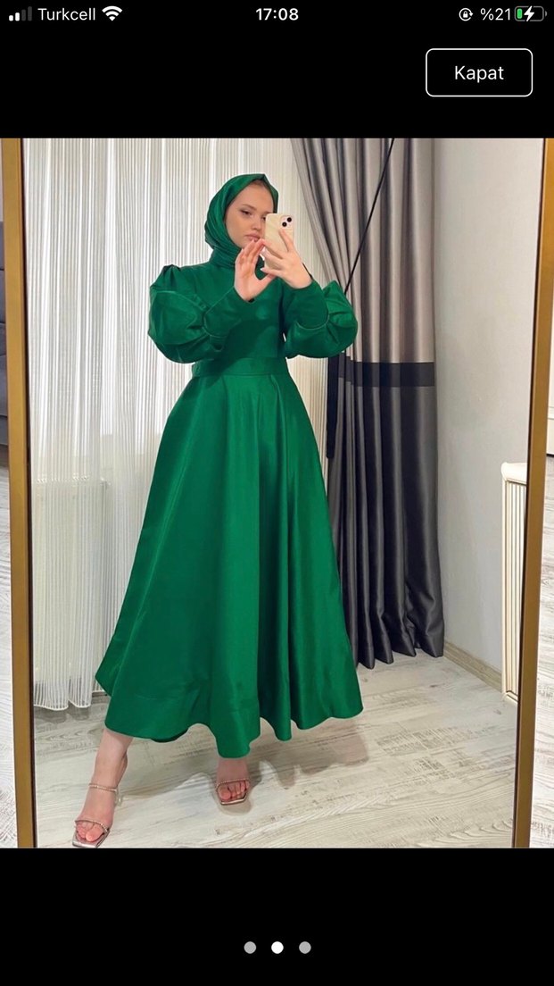 Uzun, bol kesim elbise, drapeli detaylara ve yüksek yakaya sahiptir. Yeşil, parlak ve saten dokulu kumaştan yapılmıştır. ✨36-38 bedenler içindir