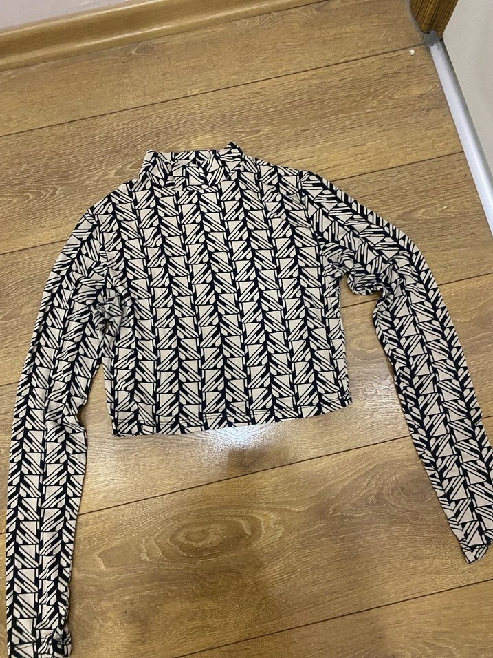 Uzun kollu ve yüksek yakalı, zebra desenli triko bluz. Fitted kesimiyle günlük kullanıma uygun, şık bir streetwear parçası.
