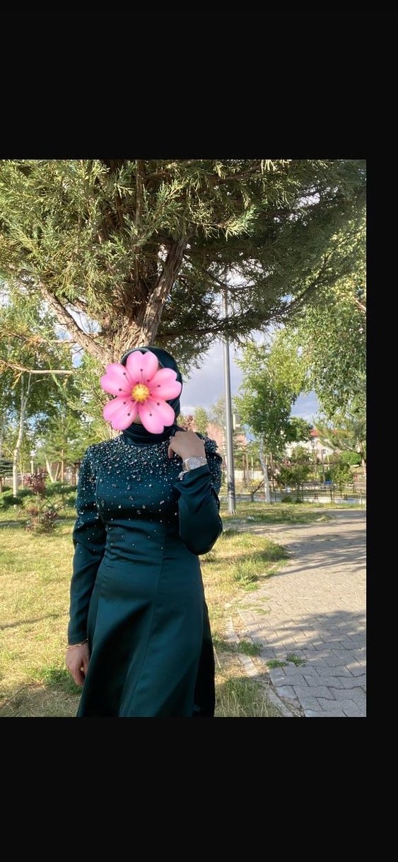 Uzun Kollu Yüksek Yakalı Zümrüt Yeşili Tesettür Abiye Elbise