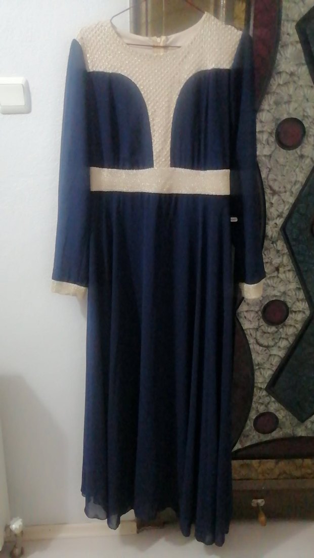 Uzun kollu, yuvarlak yakalı koyu mavi uzun elbise, dökümlü detaylara sahip. Şifon kumaştan, sade ve şık tasarımlı, tesettürlüler için, düğüne de uygun.