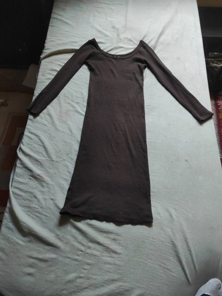 Düz kahverengi, uzun kollu, tekne yaka, midi boy triko elbise. Yumuşak sentetik kumaştan, minimal ve rahat günlük kullanım için uygundur.