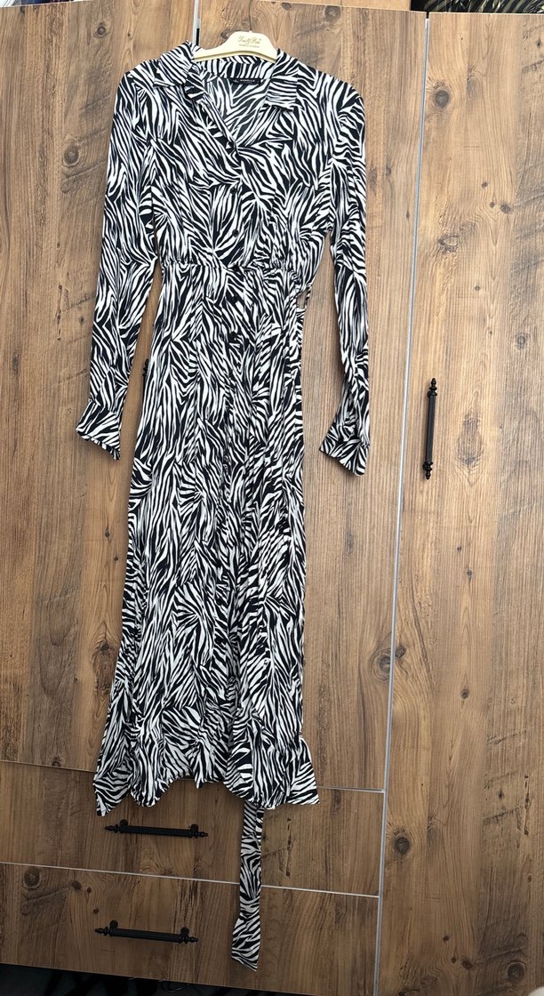 Uzun kollu, bol kesim, zebra desenli ve V yakalı sentetik kumaştan bohem tarzda günlük kullanıma uygun elbise, kürk detaylı. Sıfır ürün sanıyorum bir kez giyildi