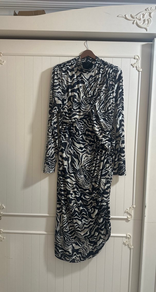 zebra desenli, drapeli ve yüksek yakalı uzun kollu, dar kesim uzun elbise. H&M marka xl beden hiç kullanılmadı büyük bedene uygun, esnek, arkadan fermuarlı