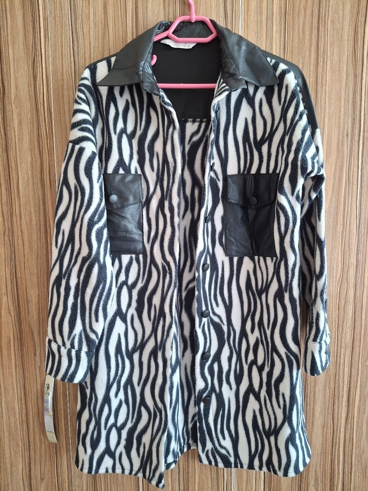 Zebra desenli, uzun kollu, uzun kesim kadın gömleği. Suni kumaştan, kürk detaylı ve notlu yaka ile rahat kesim. Gri renkte, sokak stiline uygun.