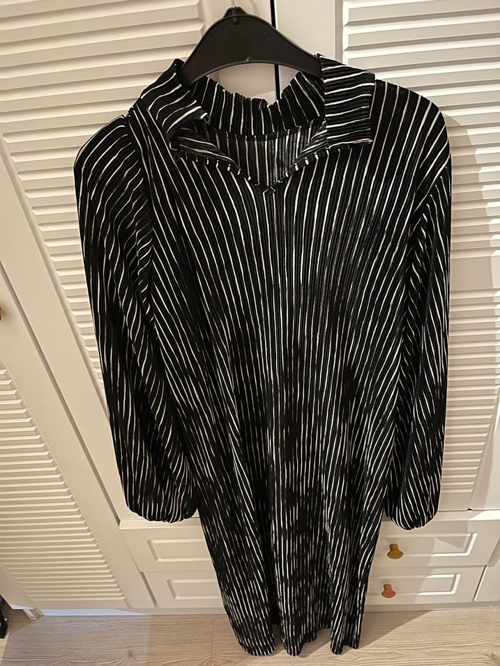 Bu kadın tunik, pilili tasarımı, yakalı ve uzun kollu yapısıyla dikkat çeker. Siyah beyaz zebra deseni ve regular kesimiyle ofis için uygundur. Sentetik kumaştan üretilmiş, gotik ve Parisli avant-garde tarzı sunar.