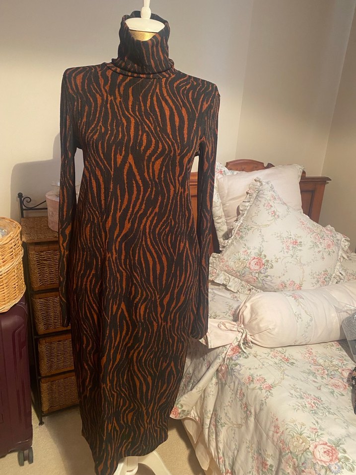 Kahverengi zebra desenli, uzun kollu ve yüksek yakalı, uzun elbise. Avant-garde ve bohem tarzı yansıtır. Esnek kumaş, etiketli ürün