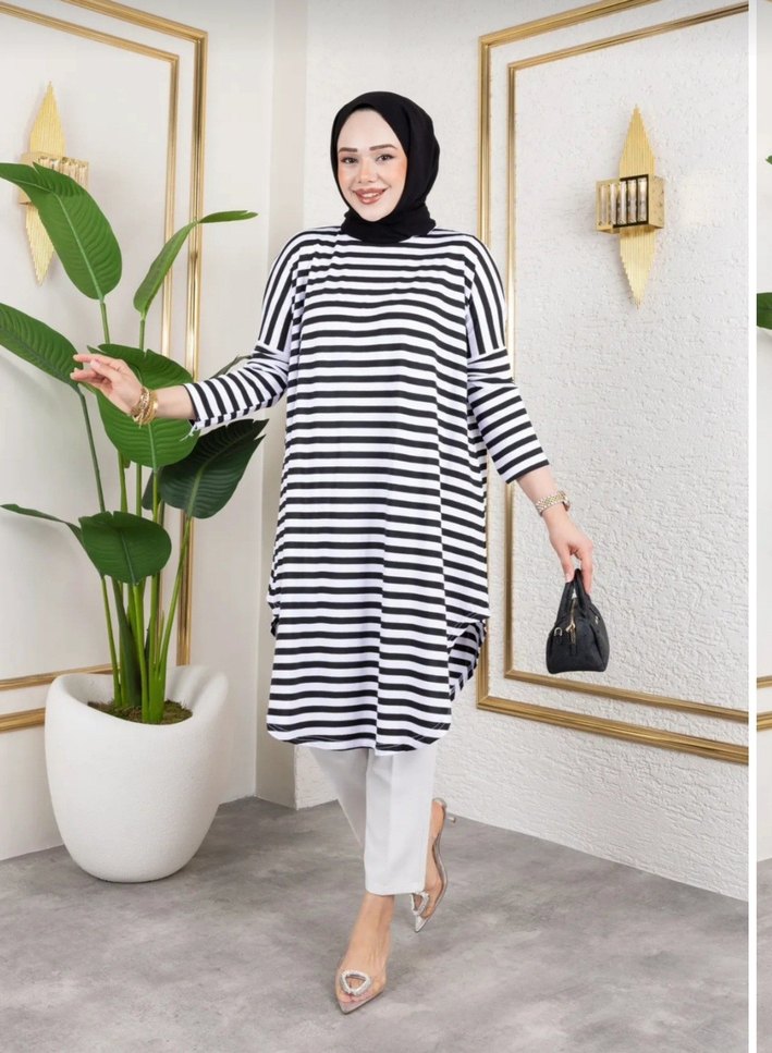 Uzun Kollu Zebra Desenli Pamuklu Tunik