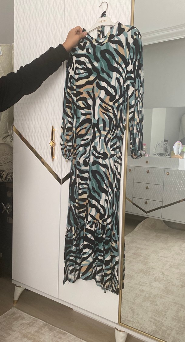 Uzun kollu, salaş kesim elbise, yüksek yakalı ve gri tonlarda zebra desenli. Yumuşak sentetik kumaştan, ve bohem tarzına uygun.