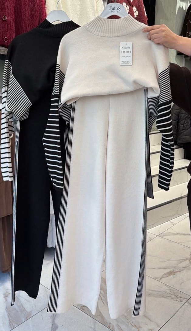 Kadınlar için uzun kollu, beyaz ve gri zebra desenli tulum. Balıkçı yaka ve kemerli, rahat kesimle günlük kullanıma uygun.