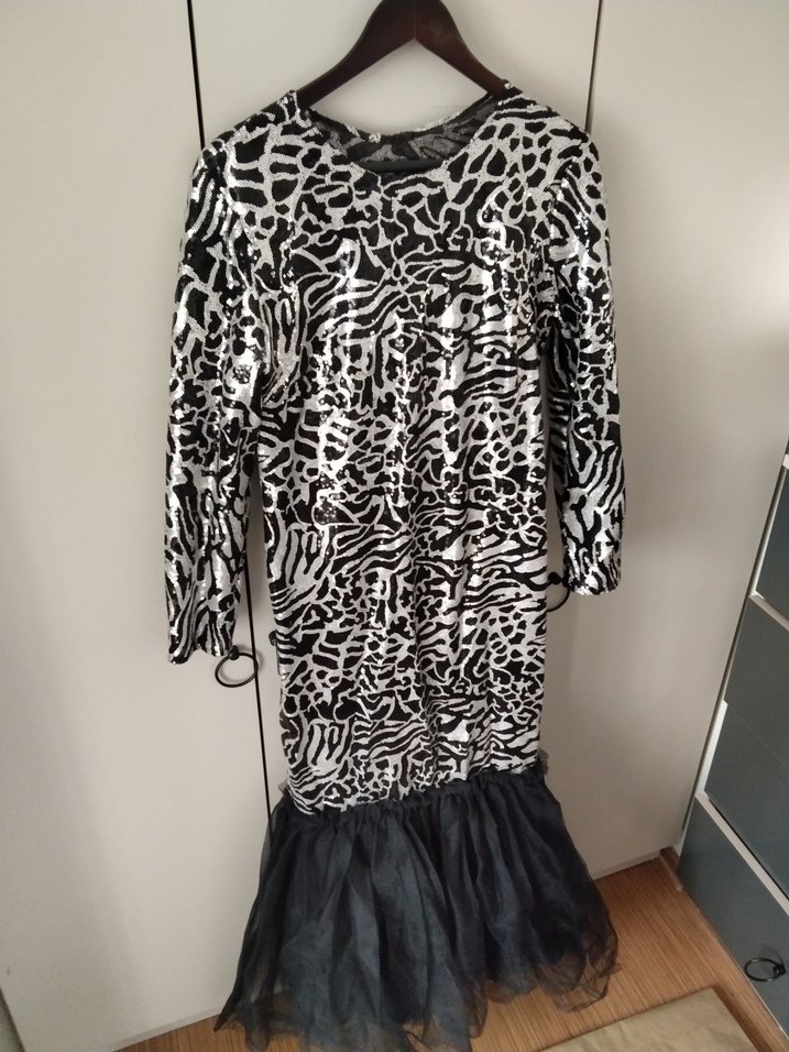 Kadınlar için uzun kollu, salaş kesim ve yuvarlak yakalı abiye elbise. Siyah beyaz zebra deseni ve volanlı etek ucu ile avant-garde tarzı sevenlere uygun.